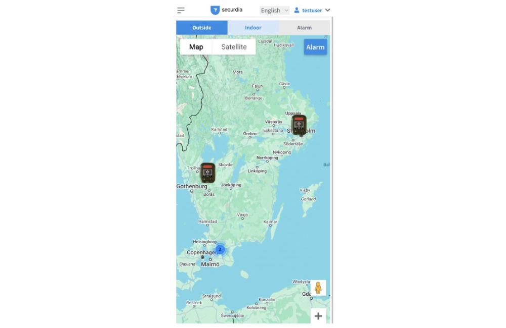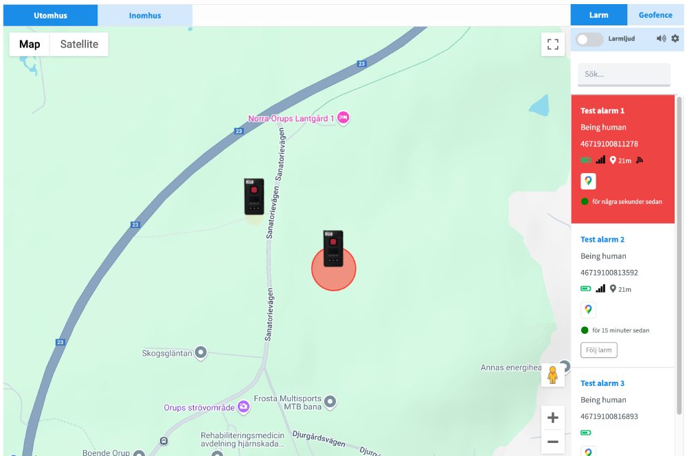 Hvis det er behov for å se hvor tilkoblede GPS-enheter befinner seg i sanntid, kan dette aktiveres. Hvis du har en intern alarmsentral som håndterer innkommende alarmer lokalt, finnes det en operatørvisning der du kan håndtere innkommende alarmer og følge alarmene i sanntid. Det er også mulig å bekrefte disse alarmene, ta notater og administrere prøvealarmer. Det er også mulig å sende live-lenker ved alvorlige alarmer til forhåndsvalgte mottakere via SMS eller e-post.
